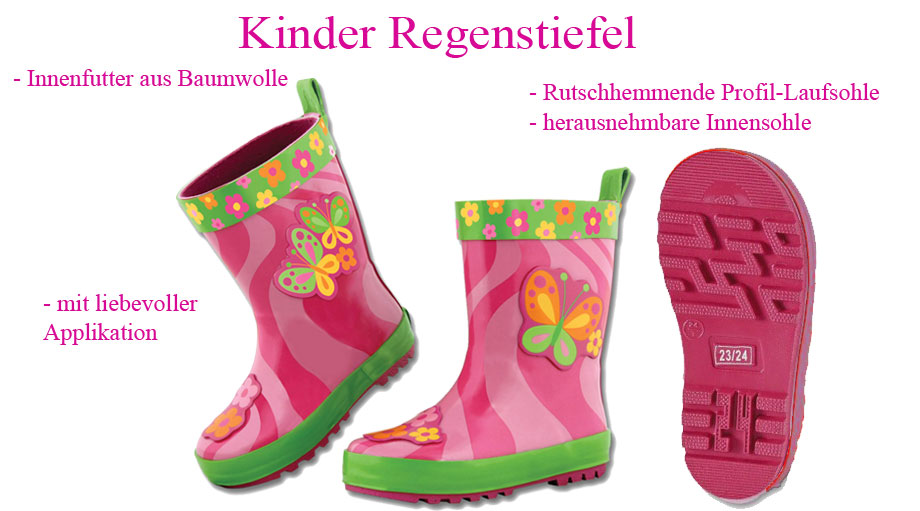 Modisch bunte Kinder Gummistiefel oder auch Regenstiefel für Kindern und Babys. Ob Punkte, Streifen, Pirat, Feuerwehr, Fee, Pferd, Dino für jeden ist etwas dabei sichum für den nächsten Spaziergang im Regen, zum Spielen im nassen Sandkasten, das Laufen auf der taufrischen Wiese ausgestattet zu sein. Unsere Kunder Gummistiefel bestechen nicht nur mit modischen Akzenten, sondern bringen alle funktionelle und praktischen Details mit. Zugbänder, mit nickelfreien Ösen, dicke Profillaufsohle und geschweißte Nähte. Die Kinder Baby Regenstiefel sind natülich aus Naturkautschuck hergestellt. (Marken wie BMS, Sterntaler, Playshoes, undMaximo )