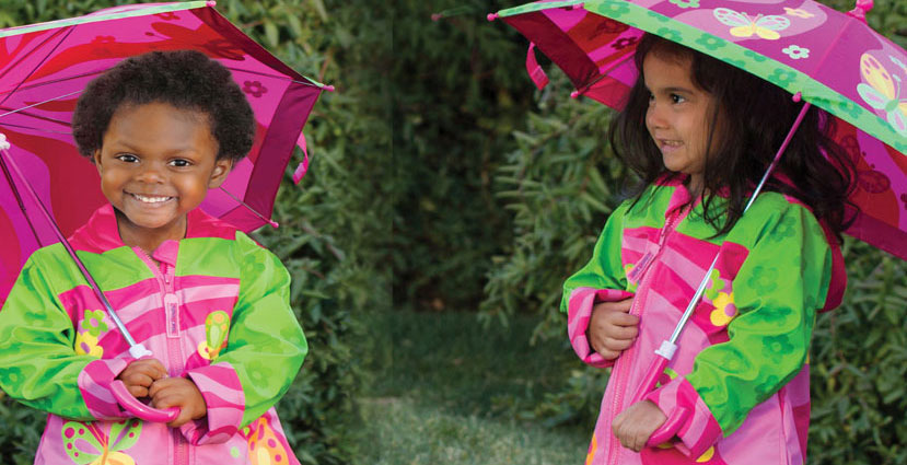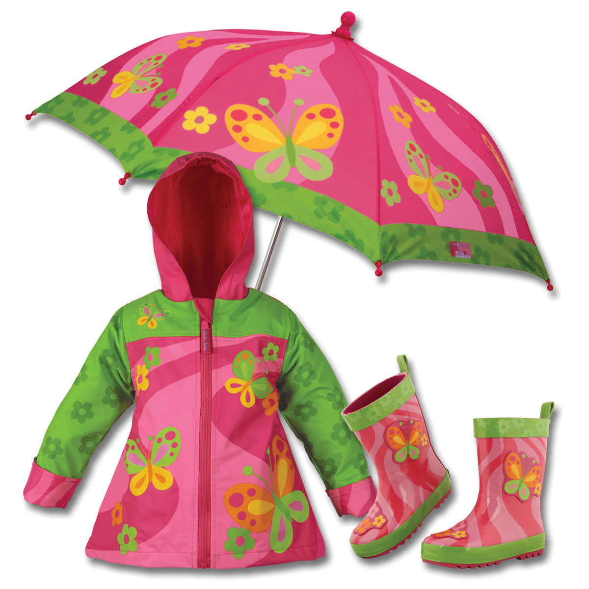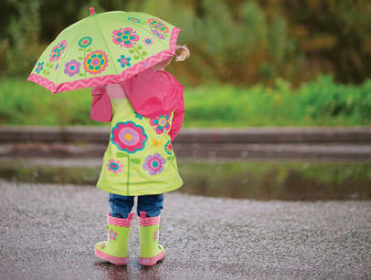 Wunderschöne Regenjacken, robuste Matschhosen und bunte Kinder Gummistiefel mit coolen Dschungel- und süßen Blumenmotiven.