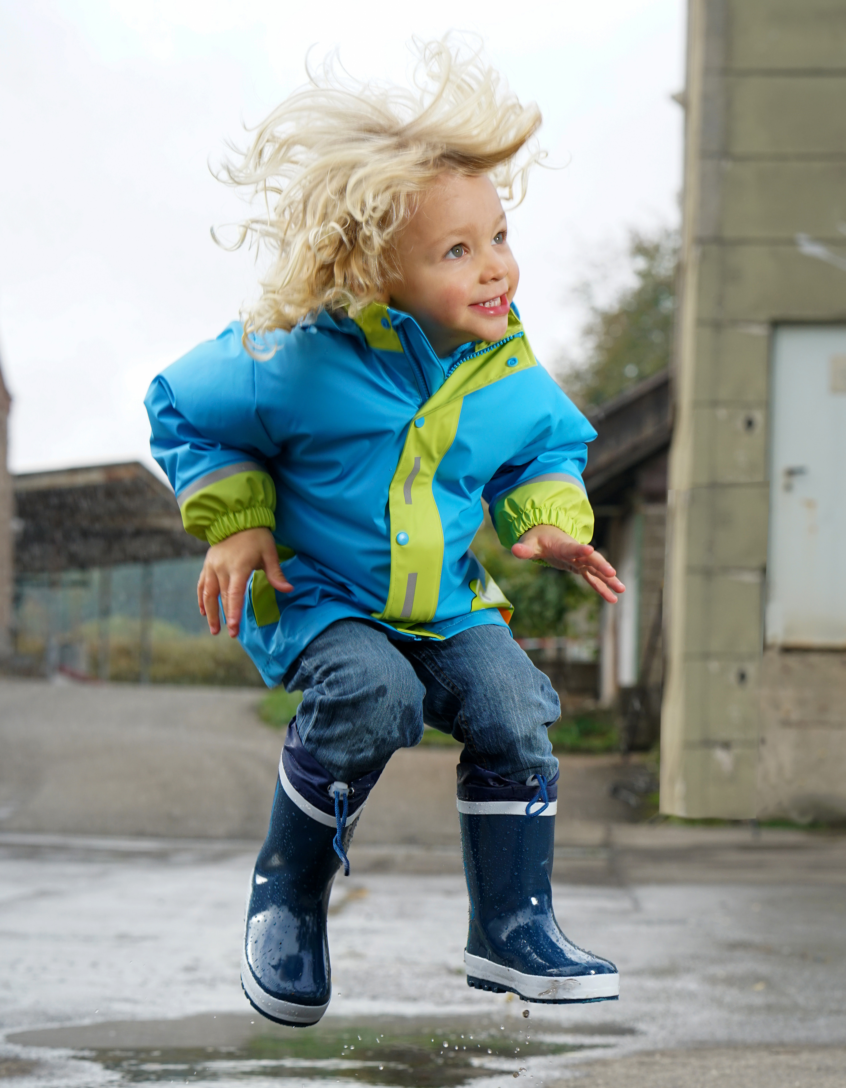 Eine zur Matschhose passende Regenjacke schützt Dein Kind optimal vor Wind und Wetter. Nicht fehlen dürfen auch Gummistiefel.